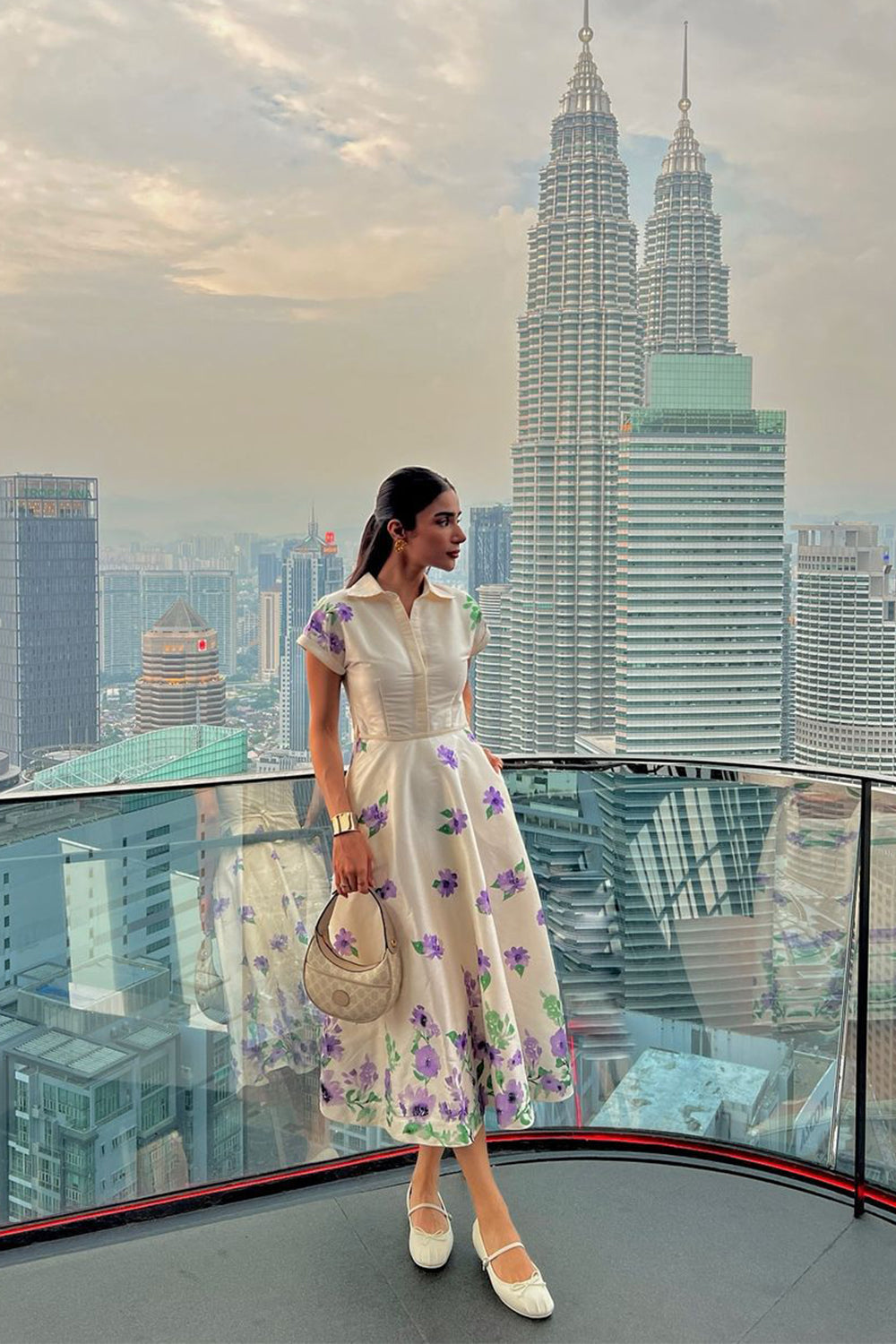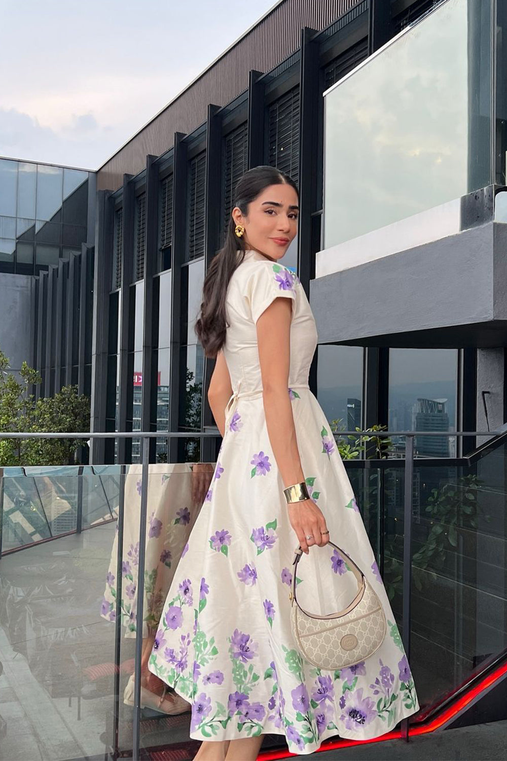 An enchanting short dress crafted from raw silk in off-white, embellished with lavender and green florals, radiating a charming and adorable allure.