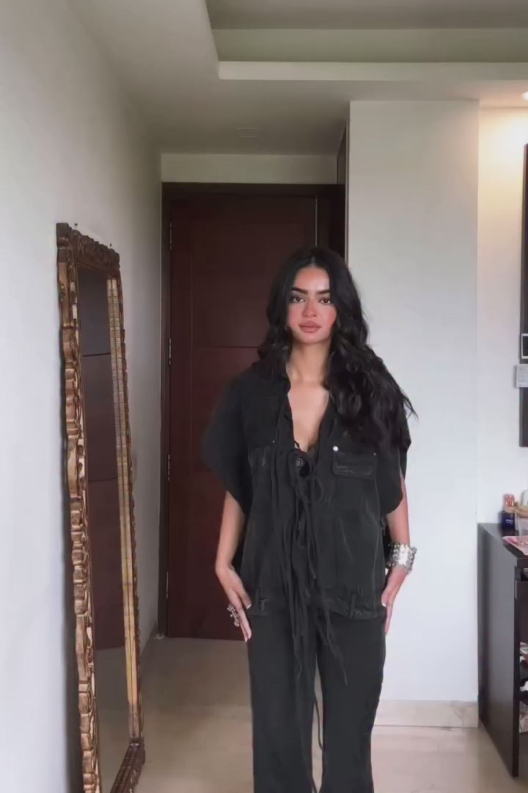 This black-grey denim coord set strikes the perfect balance between edgy and elegant. The top features trendy crisscross tie details, adding a bold, stylish touch, while the pants are adorned with delicate floral embroidery, giving them a unique, feminine flair. The set is incredibly versatile, easily dressed up for a formal dinner with heels or dressed down for a laid-back airport look with sneakers. Its understated design and subtle sophistication make it just as perfect for a casual Sunday brunch or a night out. A true wardrobe staple that adapts effortlessly to any occasion.