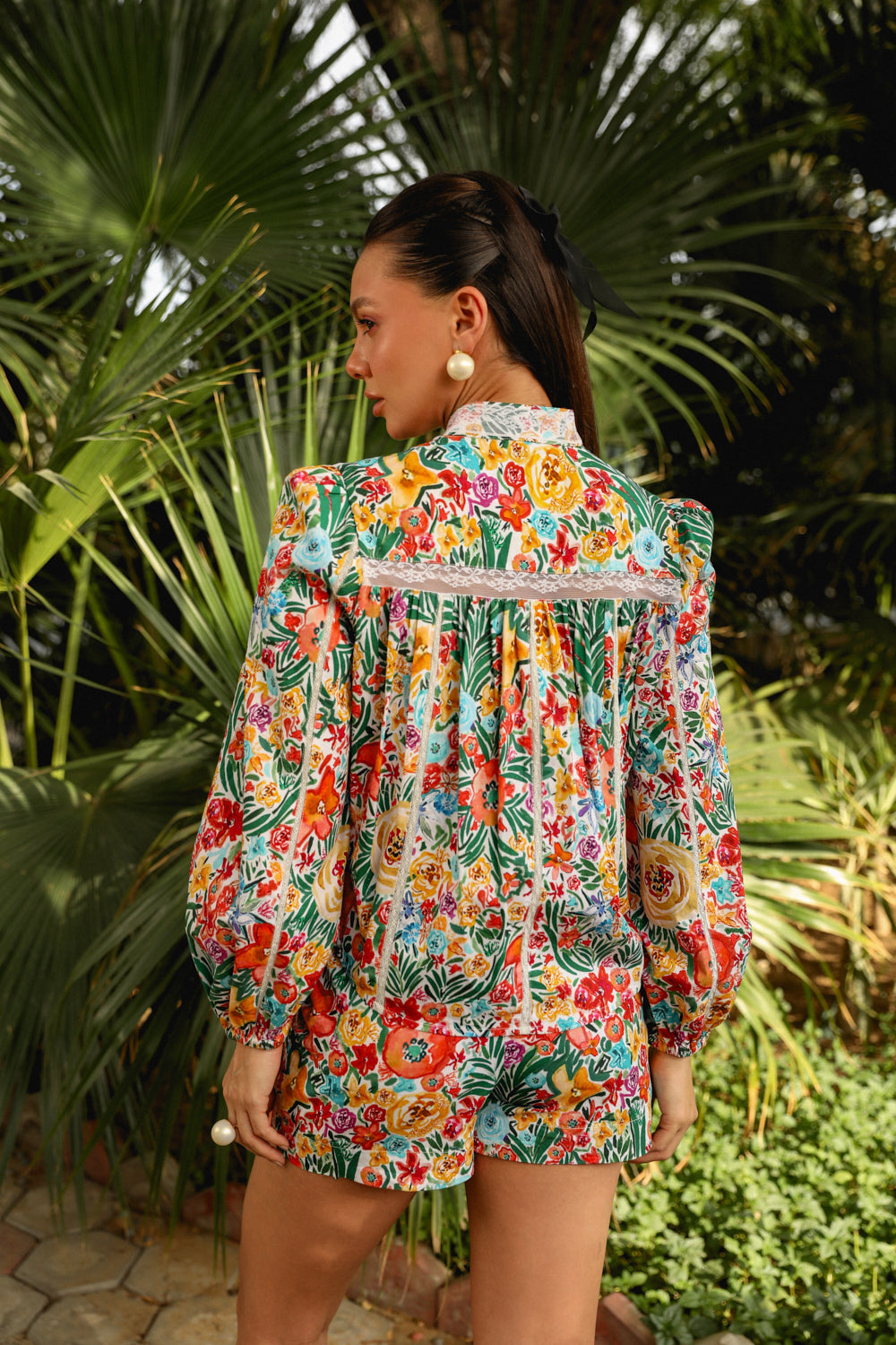 A casual yet very comfortable co ord set adorned with intricate floral prints and delicate white detailing, ideal for a picturesque summer day.