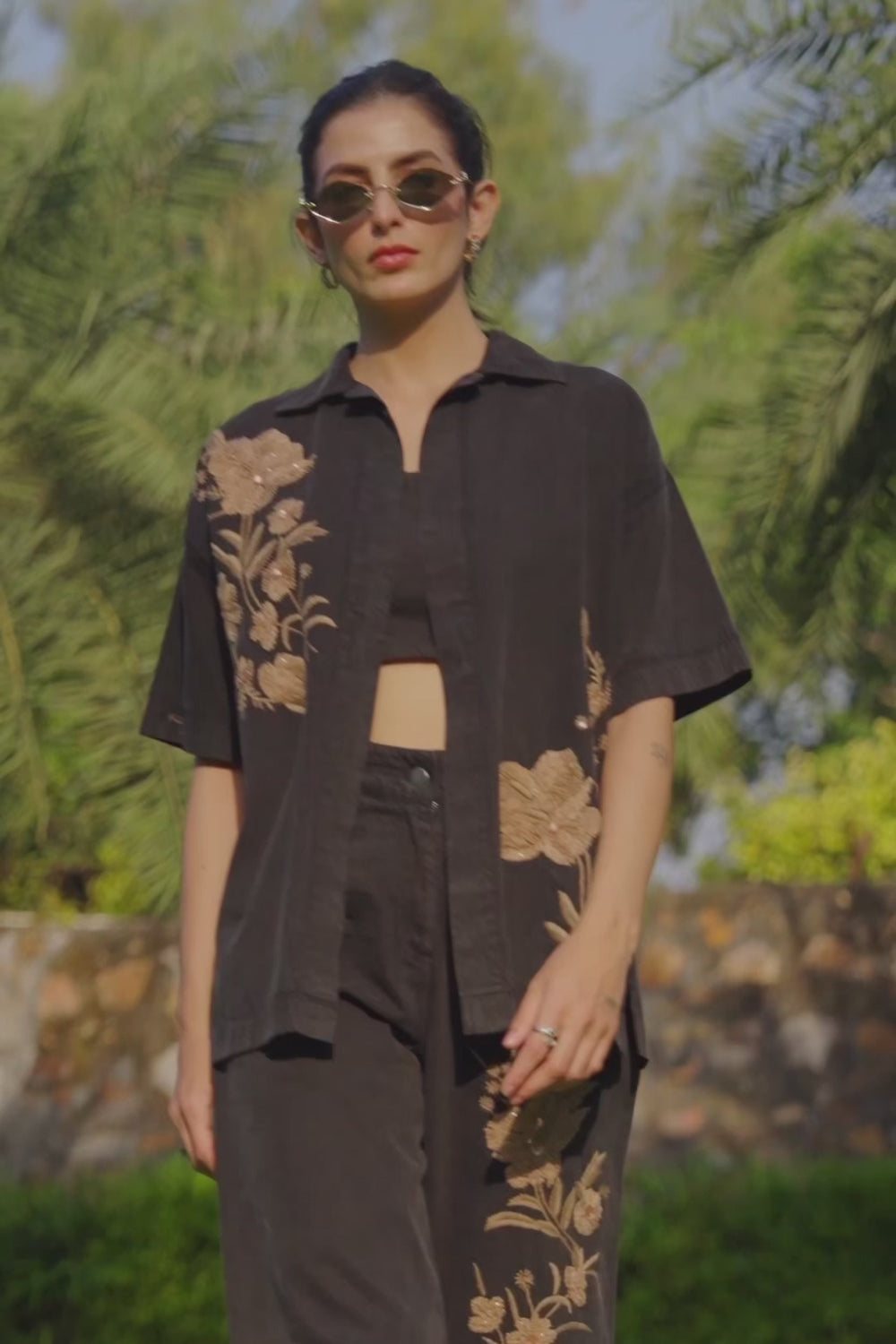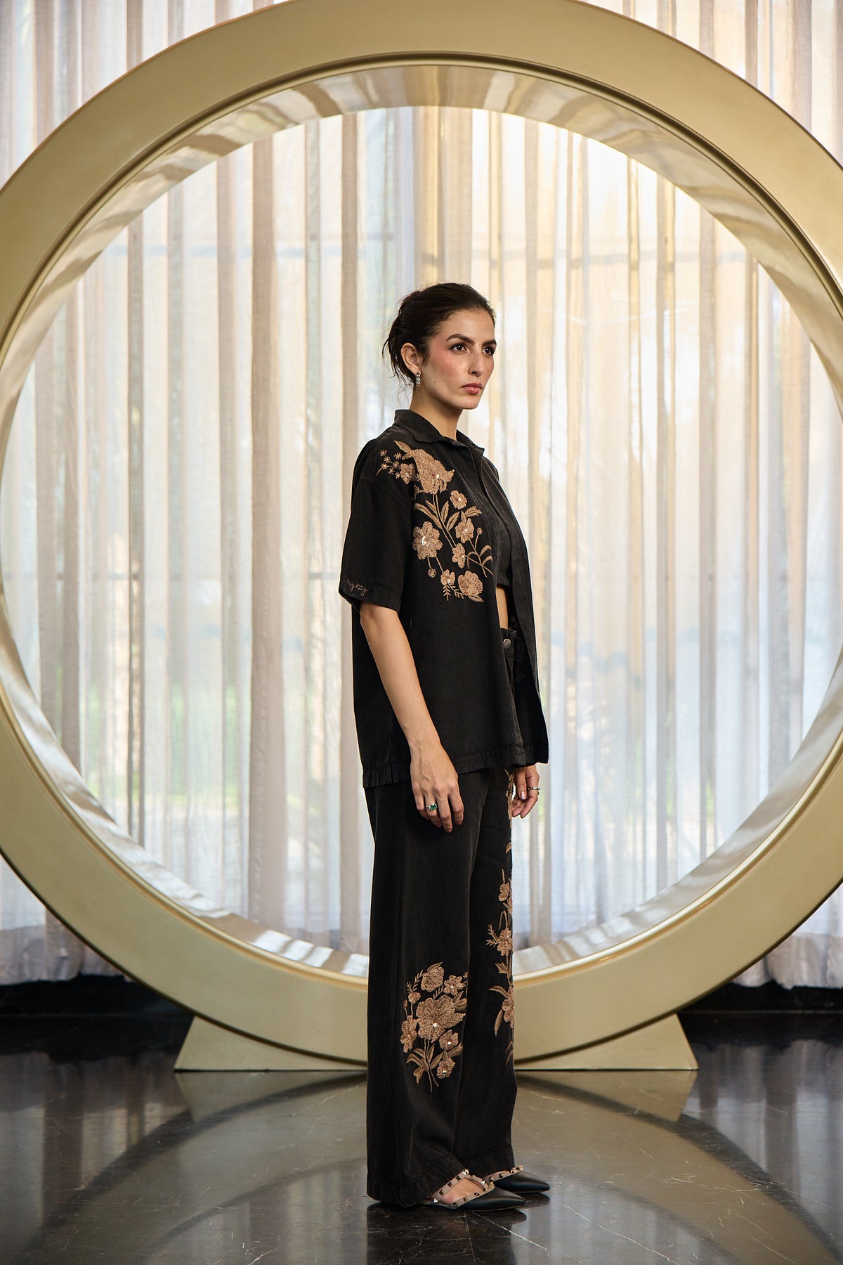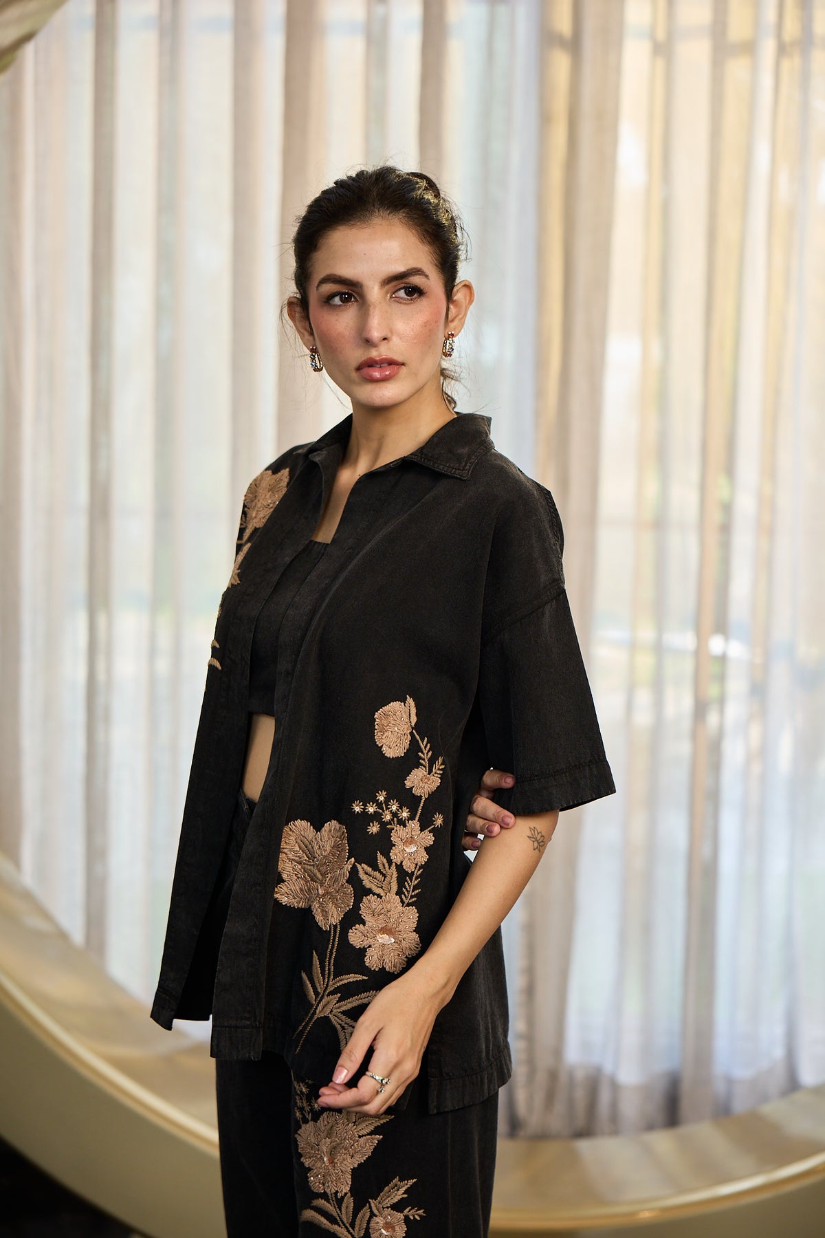 Effortlessly structured, this black denim co-ord set blends utility with elegance. Gold floral embroidery adds a touch of artistry to its relaxed silhouette, bold yet refined, just like Kay Kay.