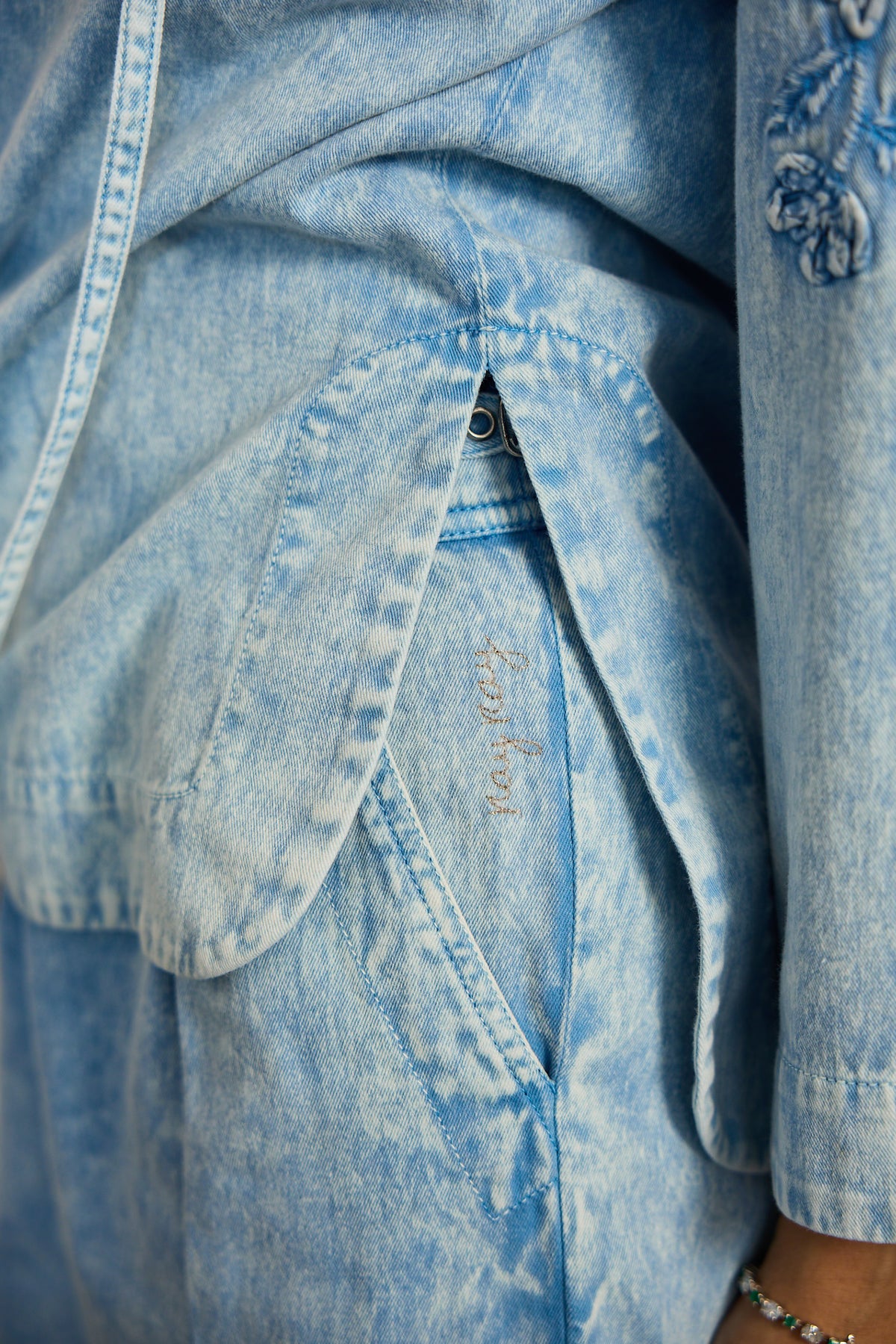 Effortlessly chic, this ice blue coord set brings together comfort and sophistication. Crafted in a breezy fabric, the relaxed-fit shirt features delicate floral motifs that gracefully flow into the wide-legged trousers, creating a harmonious and refreshing look. Perfect for brunches, vacations, or elegant casual outings, this ensemble captures understated elegance with a modern twist.