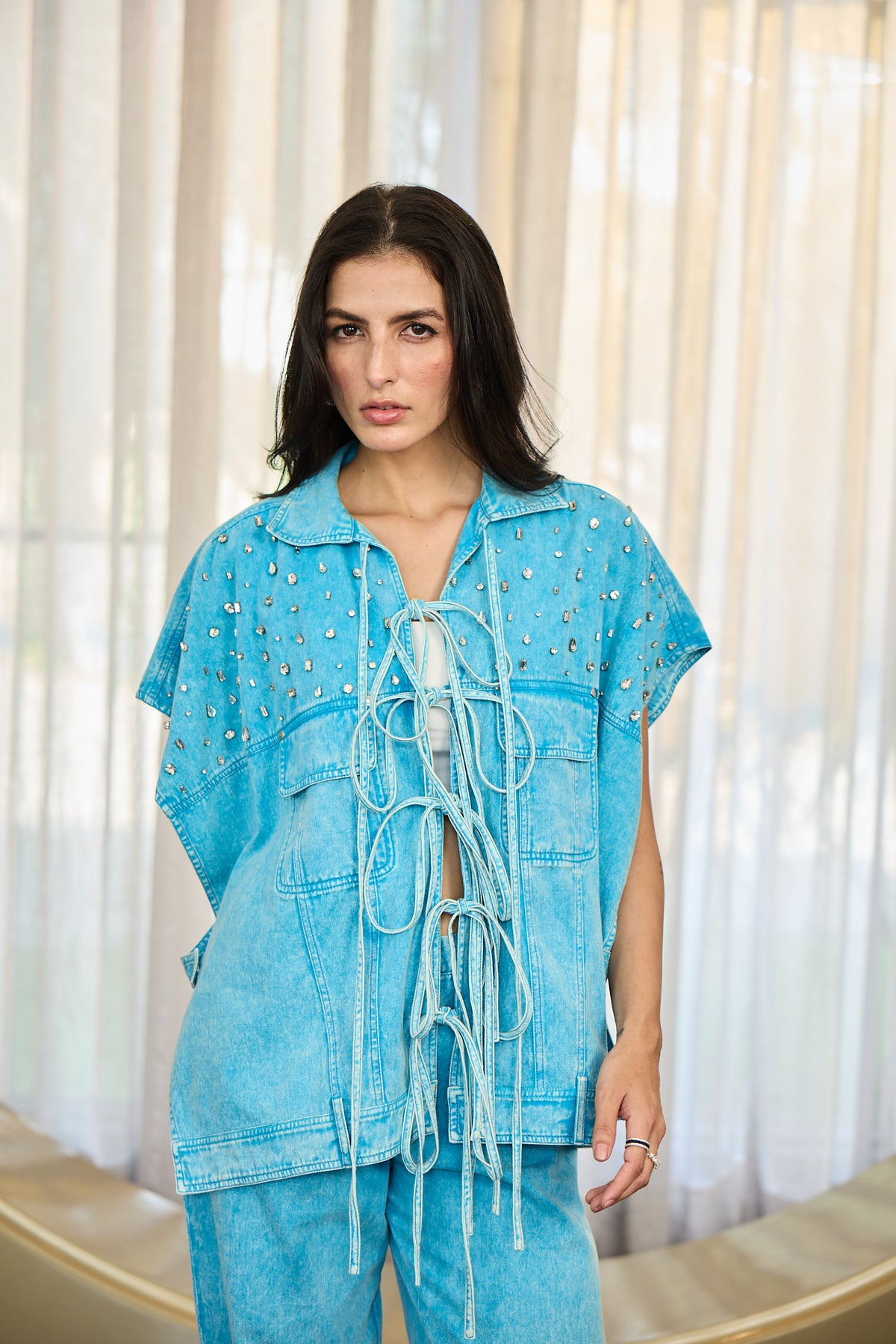 Fresh and breezy, this sky blue denim coord set brings a playful twist to everyday dressing. The soft hue and relaxed fit create an effortlessly chic, all-day look.