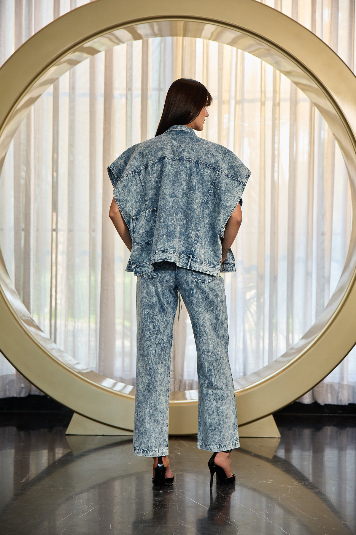 Bold yet understated, this blue overdye denim coord set blends contemporary design with casual sophistication. The richly hued denim fabric features a soft, lived-in texture that adds depth and character. Designed with a relaxed silhouette, the set pairs a boxy shirt with wide-legged trousers—making it a statement in effortless modern dressing.